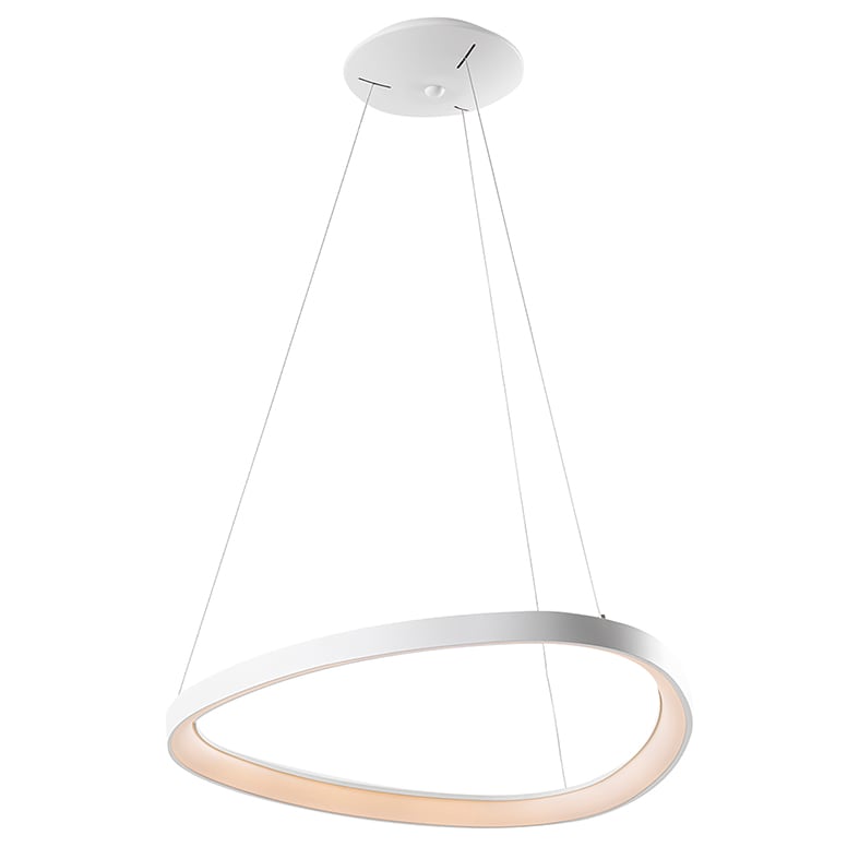 Lampada a sospensione e da soffitto a LED (3000K) in metallo verniciato dalla forma tondeggiante e asimmetrica. Corpo alto solo 5,8 cm che permette l'applicazione del prodotto in ambienti con altezze contenute. Diffusore circolare in acrilico, pieno nella parte centrale per la versione a soffitto e vuota al centro nella versione a sospensione, che consente in entrambe le soluzioni un'ottica diffusione della luce. Disponibile in tre misure e relative potenze e tre finiture colore (bianco, nero e oro).