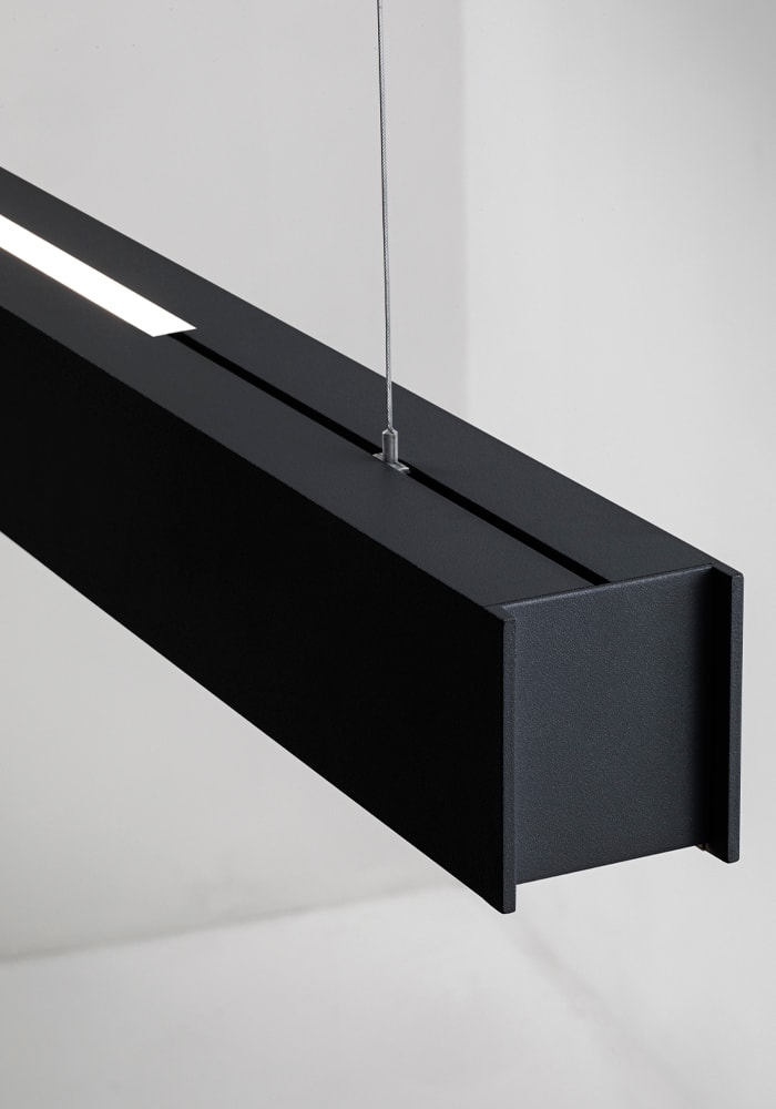 Apparecchio LED monoemissione o biemissione, per i nstallazione a sospensione o a soffitto. Corpo inalluminio estruso Made in Italy, diffusore in poli carbonato con moduli LED di ultima generazione adelevata efficienza. Configurazioni in linea o ad angolo, con differenti soluzioni di installazione e di fasci luminosi. L'aggancio rapido della sorgente LED tramite magnete e cavo di sicurezza in dotazione, garantiscono una facile e sicura sostituzione in caso di manutenzione. Disponibile con schermo prismatico e ottiche con lenti UGR<19. Due finiture (bianco e nero) e due temperature colore (3000K e 4000K). Alimentatore integrato a bordo dell'apparecchio. Prodotto conforme ai Criteri Ambientali Minimi (CAM)
