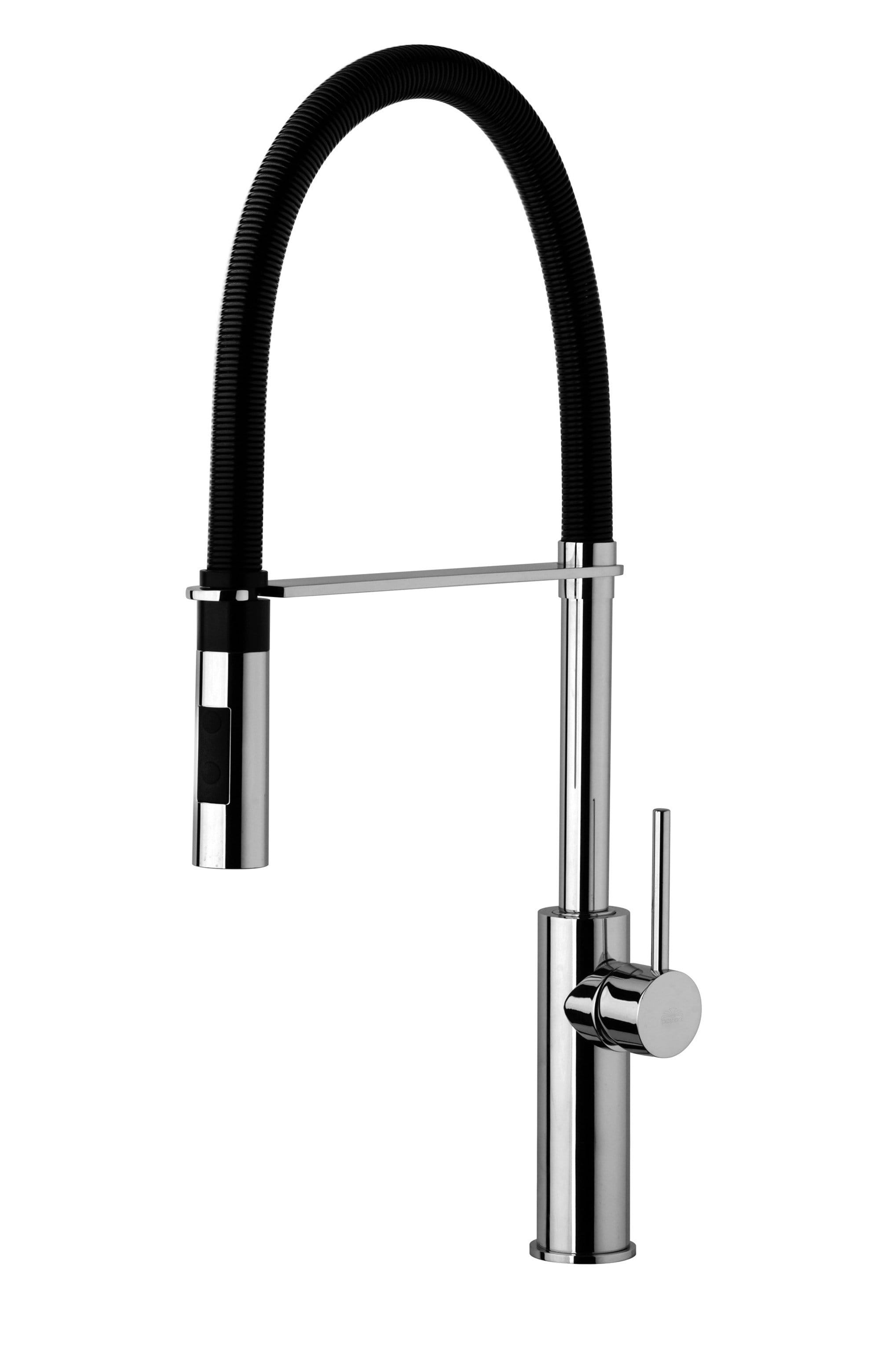 Miscelatore lavello monoforo professional con canna orientabile, completo di: • doccia Minimal (2 getti) in ABS • set 2 flessibili inox 3/8"G. Finitura cromo con molla nero opaco