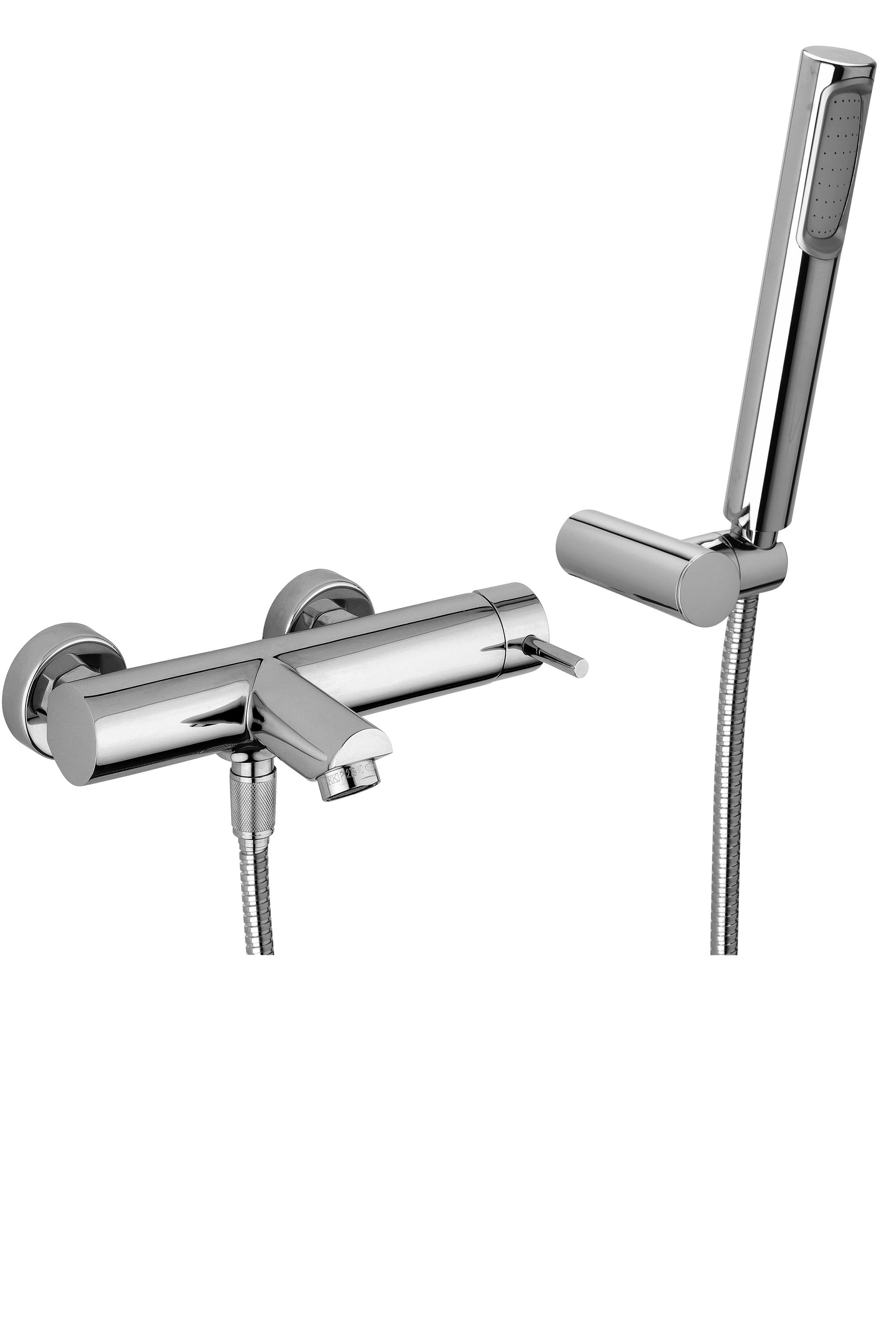 Miscelatore vasca/doccia con deviatore e con supporto a muro snodato in ABS con doccia e flessibile, completo di: • aeratore M28x1 • set 2 eccentrici 1/2”x3/4”G e rosoni. Finitura cromo
