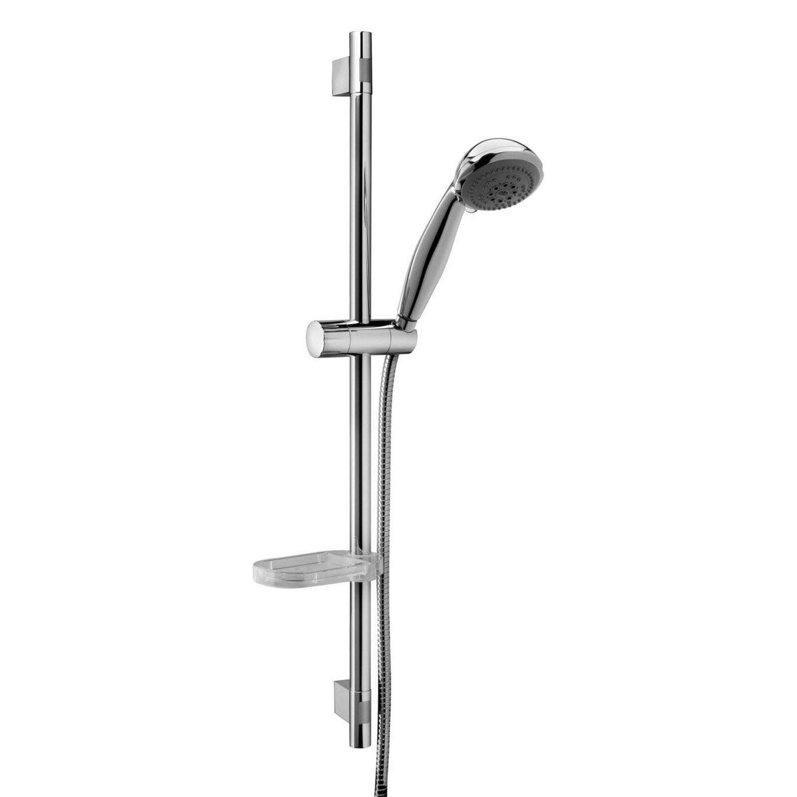 Saliscendi QUEEN con interasse 650 mm, completo di: • asta Ø22 x L.730 mm in metallo • supporti fissi in ABS • supporto doccia scorrevole in ABS • doccia Queen in ABS, 4 getti, Ø90 mm • flex metallo doppia aggraffatura 1500 mm con calotta conica girevole