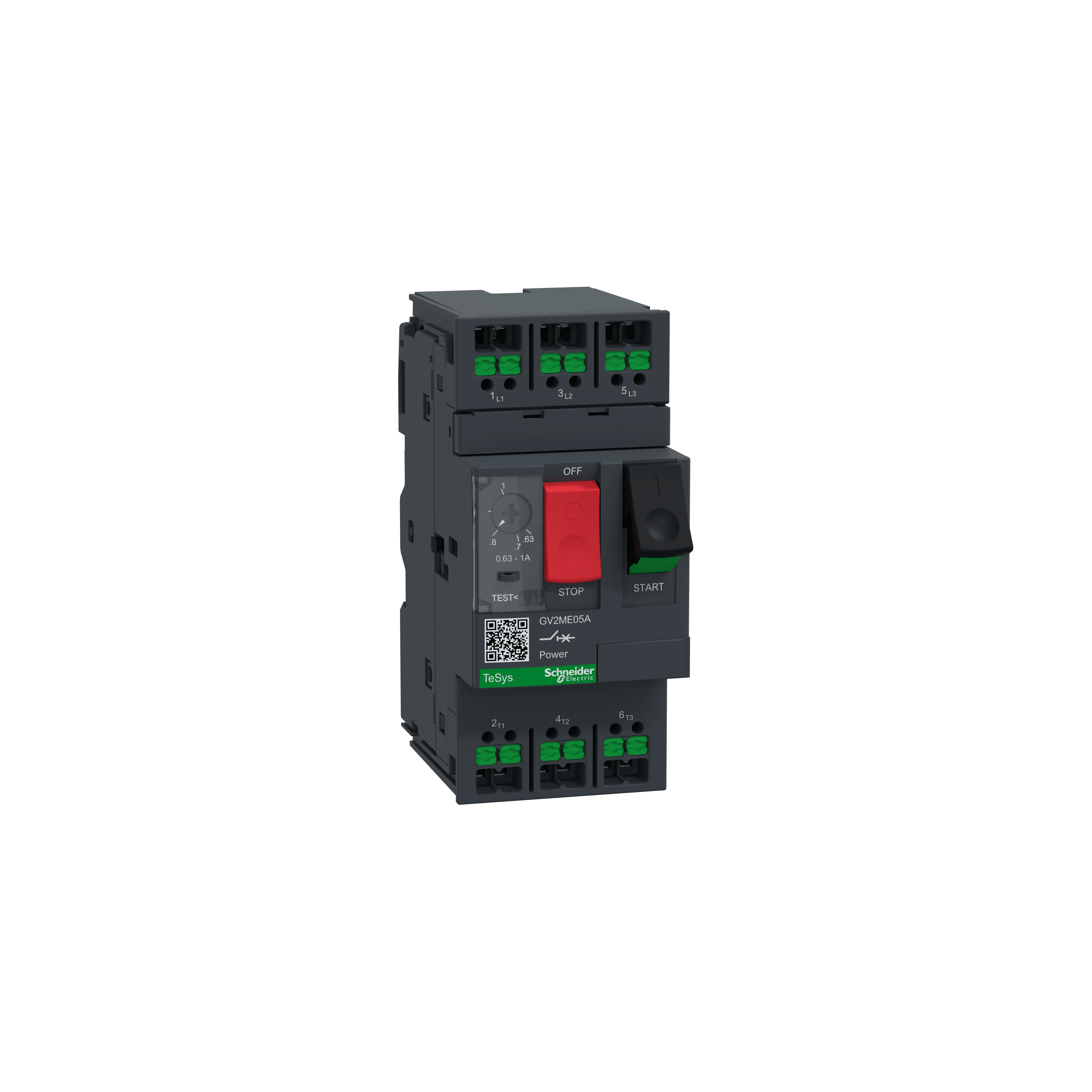 Interruttore magnetotermico TeSys GV, 3 poli (3P), 1A/690V, per applicazioni con motori trifase 0,25kW400V. Fornisce una protezione termomagnetica con un intervallo di regolazione termica compreso tra 0,63 e 1 A, intervento magnetico a 13xIn, elevata capacità di interruzione Icu 100 kA400V. È dotato di terminali SNAP IN per un cablaggio flessibile senza attrezzi e una connessione robusta e duratura. Controllo start-stop tramite pulsante garantito per 100.000 cicli AC-3. Certificato multi-standard, conforme alle normative ambientali (RoHS/REACh).