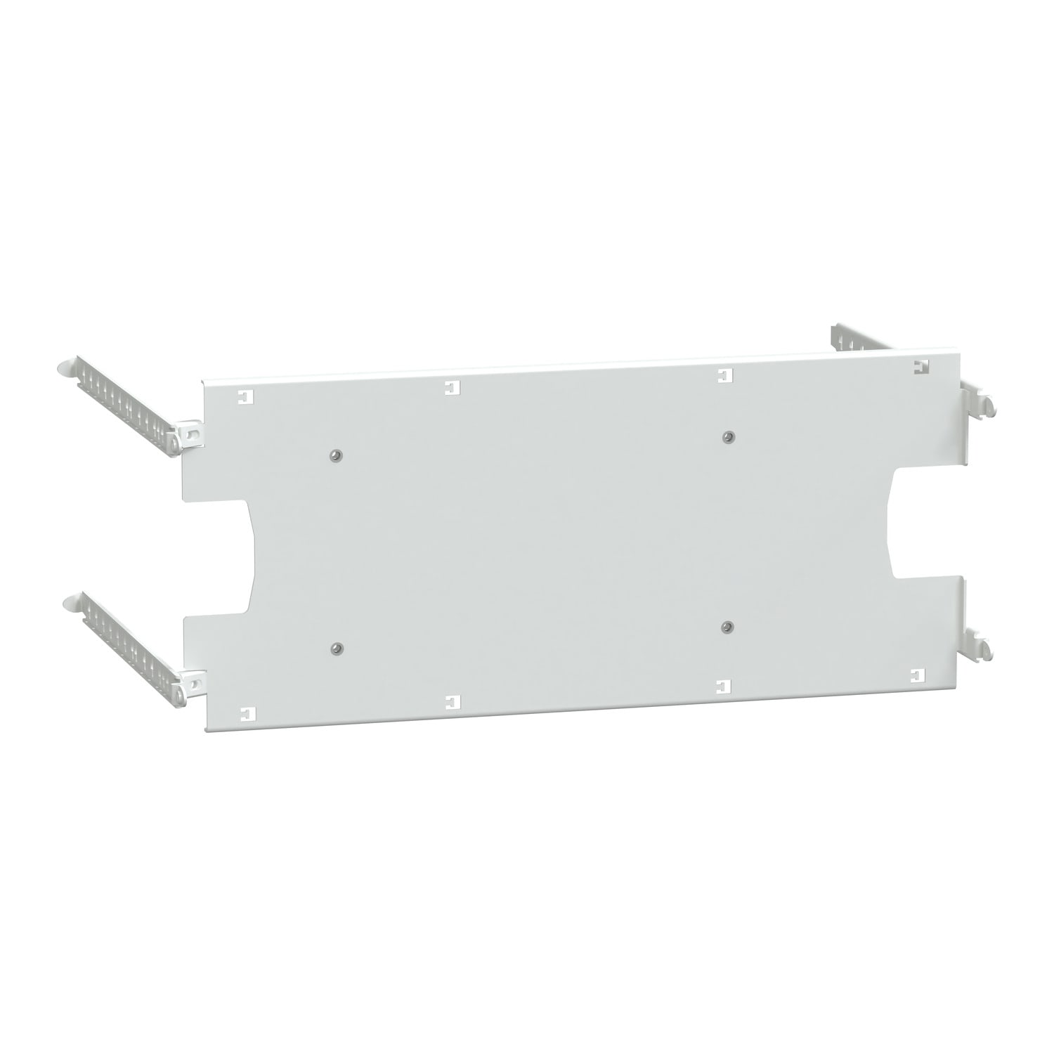PrismaSeT P & G Mounting Plate for Transfer Pact 80 to 180A, 3P/4P. Type of Mounting plate is plain plate. Number of device per horizontal rows is 1, with vertical 8 modules. To be part of a PrismaSeT G vertical Fixed front plate. for floor-standing enclosure - width 650/650+150 mm & depth 400 mm. Mounting Plate made with Epoxy powder coat treated sheet steel. matt/textured surface finition with white (RAL 9003). Ambient air temperature for operation is from 25 to 55 °C conforming to IEC 61439-1/ IEC 61439-2.