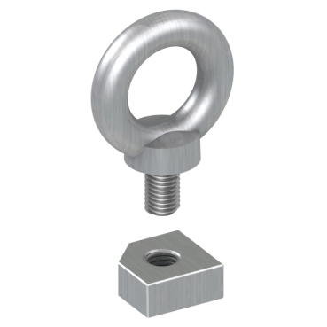 Set di golfari di sollevamento M12 per PanelSeT SF/SFM. A 61,5 x L 54 x P 26 mm. Montaggio sulla parte superiore dell'armadio. Carico permanente ammissibile 1360 kg a 60°. Acciaio pressofuso, finitura superficiale zincata. Set di 4 dadi di fissaggio e 4 golfari di sollevamento.