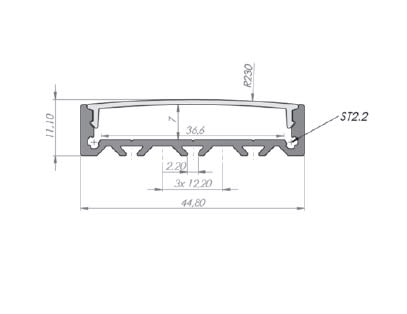 Caratteristiche: Larghezza 44,80 mm per potervi alloggiare fino a 3 strip LED. Copertura rimovibile con un click. Utilizzabile come corpo illuminante indipendente. Utilizzabile con Strip LED di bassa/alta potenza. Applicazioni: Illuminazione principale del banco “reception” negli hotel. Illuminazione di vetrine. Copertura acidata.