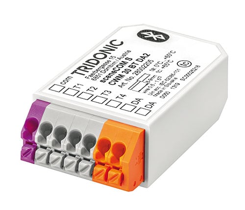 sceneCOM S CWM 30 BT DA2. Assiste tutta la gamma di alimentatori Tridonic con DALI e DALI2, ed anche alimentatori di altre marche certificati DALI e DALI-2
