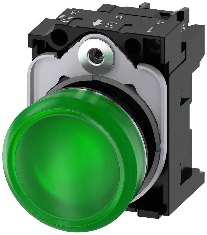 indicatore luminoso, 22 mm, rotondo, in metallo, lucido, verde, lente, liscio, con supporto, modulo LED con LED integrato AC 230 V, morsetto a vite Indicatore luminoso SIRIUS ACT per la segnalazione di stati di commutazione o guasti in impianti, con forte intensità luminosa grazie alla tecnologia LED ad efficienza energetica. Siemens offre, sotto il nome commerciale SIRIUS ACT, un portfolio esclusivo di dispositivi di comando e segnalazione con omologazioni di prodotto per il mercato mondiale in tre moderne serie di design in robusto metallo puro e plastica pregiata.Linnovativo concetto di innesto a scatto semplifica talmente il montaggio che per eseguirlo basta una sola mano e non servono attrezzi speciali. Per i fori di montaggio sono sufficienti semplici fori non scanalati, essendo già integrata una protezione antirotazione al 100 %.Grazie al grado di protezione elevato i robusti apparecchi sono adatti allimpiego industriale e in ambiente esterno. È persino possibile la pulizia con getto ad alta pressione. Né polvere, né oli, né liscivia possono comprometterne il funzionamento affidabile.Oltre che con il cablaggio standard, gli apparecchi possono essere collegati al controllore anche tramite PROFINET, AS-Interface oppure IO-Link. Potete così ridurre il vostro onere di cablaggio, minimizzare le fonti di errore e ottenere maggiore flessibilità.Il configuratore online grafico supporta in modo confortevole la scelta e lordinazione di singoli apparecchi, pulsantiere e iscrizioni. È disponibile una documentazione completa (ad es. manuale, dati 3D, schema di collegamento). Esecuzioni fornibili: più colori, diverse varianti di tensione. Avvertenza: Apparecchio completo, fornitura incl. supporto e moduli. SIRIUS ACT - Performance in Action nel comando e nella segnalazione. Semplici da montare, altamente performanti, semplicemente perfetti.