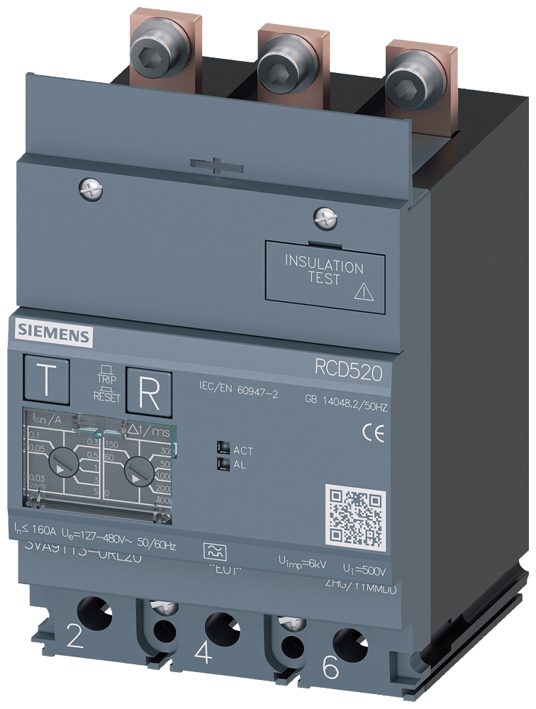 dispositivo di protezione differenziale RCD520 Basic RCD Tipo A montato in basso corrente di guasto nominale 0,03 ... 5 A a 50/60 Hz tempo regolabile 0 ... 3000 ms a 3 poli In=160A Ue=100-480V Accessori per: 3VA1 Interruttori automatici scatolati SENTRON3VA - un sistema. Per tutte le applicazioni.