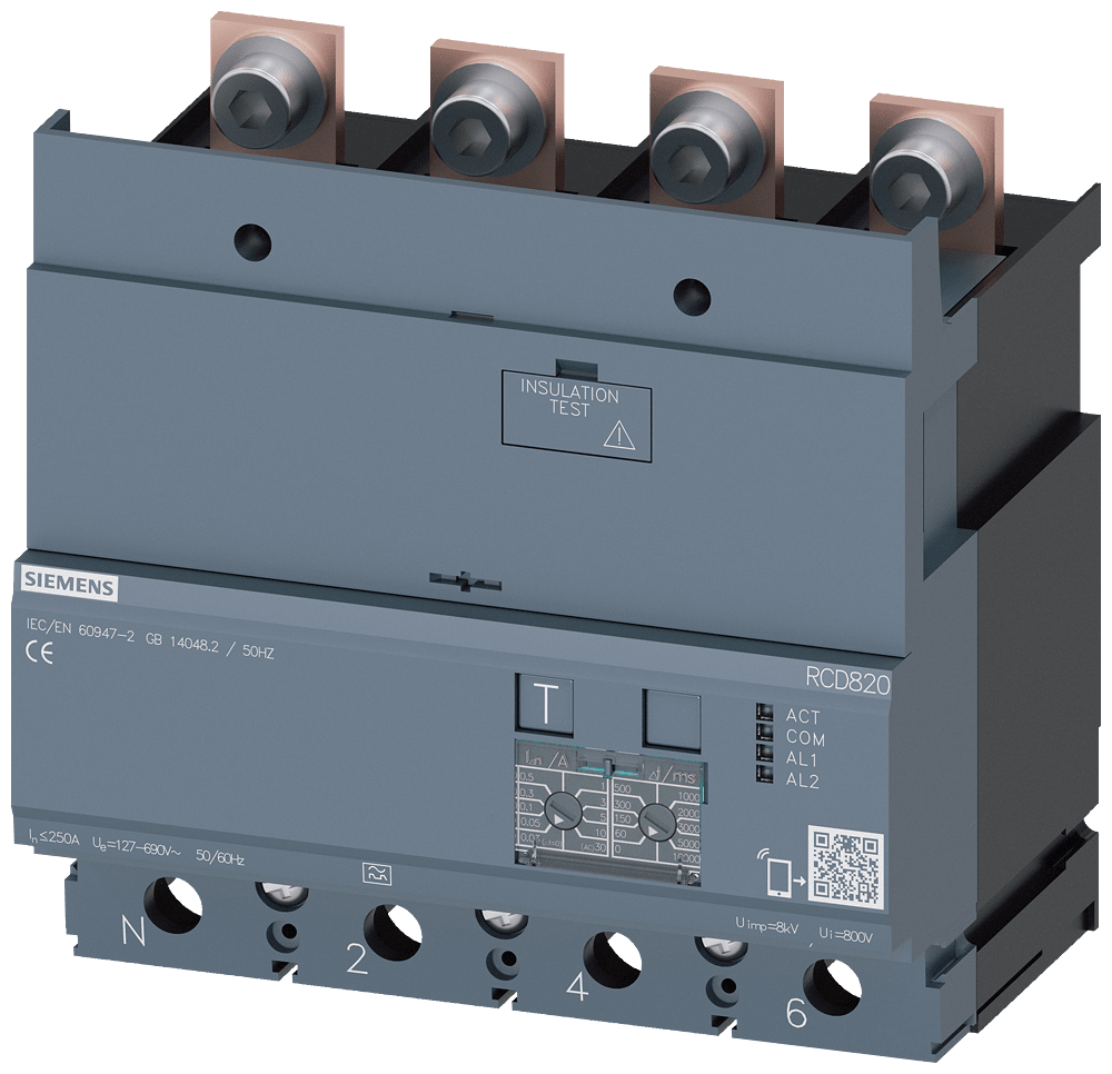 dispositivo di protezione differenziale RCD820 Advanced RCD Tipo A montato in basso corrente di guasto nominale 0,03 ... 30 A a 50/60 Hz tempo regolabile 0 ... 10000 ms a 4 poli In=250A Ue=100-690V Accessori per: 3VA2 Interruttori automatici scatolati SENTRON 3VA - un sistema. Per tutte le applicazioni.