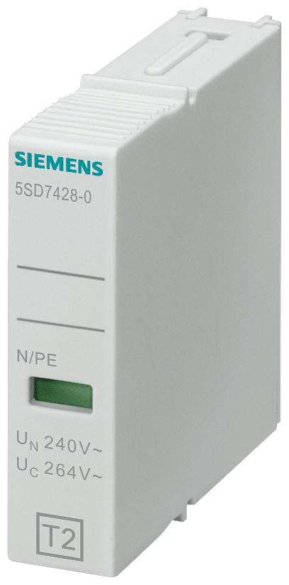 cartuccia estraibile tipo 2 N-PE classe di requisiti C, Uc 260V a 1 polo, forma costruttiva stretta per scaricatore di sovratensioni 5SD742...e scaricatore combinato 5SD744. Apparecchi di protezione da sovratensione in impianti elettrici. Gli apparecchi di protezione da sovratensioni di Siemens, quale parte integrante importante dei componenti di protezione SENTRON per linstallazione elettrica, offrono una protezione efficace contro fulmini e sovratensioni a seguito di perturbazioni atmosferiche o di manovre. Una tecnica di montaggio e una tecnica di collegamento comode nonché un design omogeneo sono le caratteristiche essenziali della famiglia di apparecchi. Sia che si tratti di esigenze applicative nellinfrastruttura o nellindustria, Siemens offre apparecchi di protezione da sovratensioni per tutte le applicazioni e per qualsiasi campo dimpiego. Gli apparecchi di protezione da sovratensioni Siemens si contraddistinguono soprattutto per le seguenti caratteristiche: 1. Protezione efficace dellinvestimento e dellimpianto da fulmini e sovratensioni. 2. La protezione da fulmini e sovratensioni adatta per ogni caso applicativo (tipo da 1 a 3). 3. Contatto di segnalazione a distanza per lupload esterno della visualizzazione di stato. 4. Sicurezza affidabile durante linstallazione grazie alla protezione avvolgente e alla protezione contro i contatti accidentali come standard di serie. 5. Rimozione senza attrezzi dalla guida DIN. 6. Visualizzazione errore chiaramente visibile. 7. Il codice DataMatrix sul frontale dellapparecchio fornisce tutte le informazioni sulla protezione da fulmini e sovratensioni in modo rapido e semplice. 8. Tecnica ottimale per la vostra sicurezza - soloda Siemens.