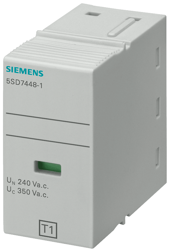 cartuccia estraibile tipo 1 L-N classe di requisiti B, Uc 350V a 1 polo per scaricatore combinato 5SD744 Apparecchi di protezione da sovratensione in impianti elettrici. Gli apparecchi di protezione da sovratensioni di Siemens, quale parte integrante importante dei componenti di protezione SENTRON per linstallazione elettrica, offrono una protezione efficace contro fulmini e sovratensioni a seguito di perturbazioni atmosferiche o di manovre. Una tecnica di montaggio e una tecnica di collegamento comode nonché un design omogeneo sono le caratteristiche essenziali della famiglia di apparecchi. Sia che si tratti di esigenze applicative nellinfrastruttura o nellindustria, Siemens offre apparecchi di protezione da sovratensioni per tutte le applicazioni e perqualsiasi campo dimpiego. Gli apparecchi di protezione da sovratensioni Siemens si contraddistinguono soprattutto per le seguenti caratteristiche: 1. Protezione efficace dellinvestimento e dellimpianto da fulmini e sovratensioni. 2. La protezione da fulmini e sovratensioni adatta per ogni caso applicativo (tipo da 1 a 3). 3. Contatto di segnalazione a distanza per lupload esterno della visualizzazione di stato. 4. Sicurezza affidabile durante linstallazione grazie alla protezione avvolgente e alla protezione contro i contatti accidentali come standard di serie. 5. Rimozione senza attrezzi dalla guida DIN. 6. Visualizzazione errore chiaramente visibile. 7. Il codice DataMatrix sul frontale dellapparecchio fornisce tutte le informazioni sulla protezione dafulmini e sovratensioni in modo rapido e semplice. 8. Tecnica ottimale per la vostra sicurezza - soloda Siemens.