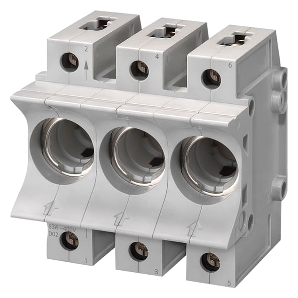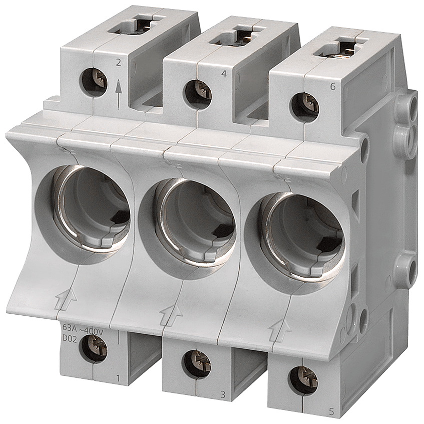 NEOZED, base portafusibili, D02, a 3 poli, 63 A, Un AC: 400 V, Un DC: 250 V morsetto serracavo doppio SENTRON 5SG5 . Dispositivi di protezione SENTRON - Una scelta sicura.