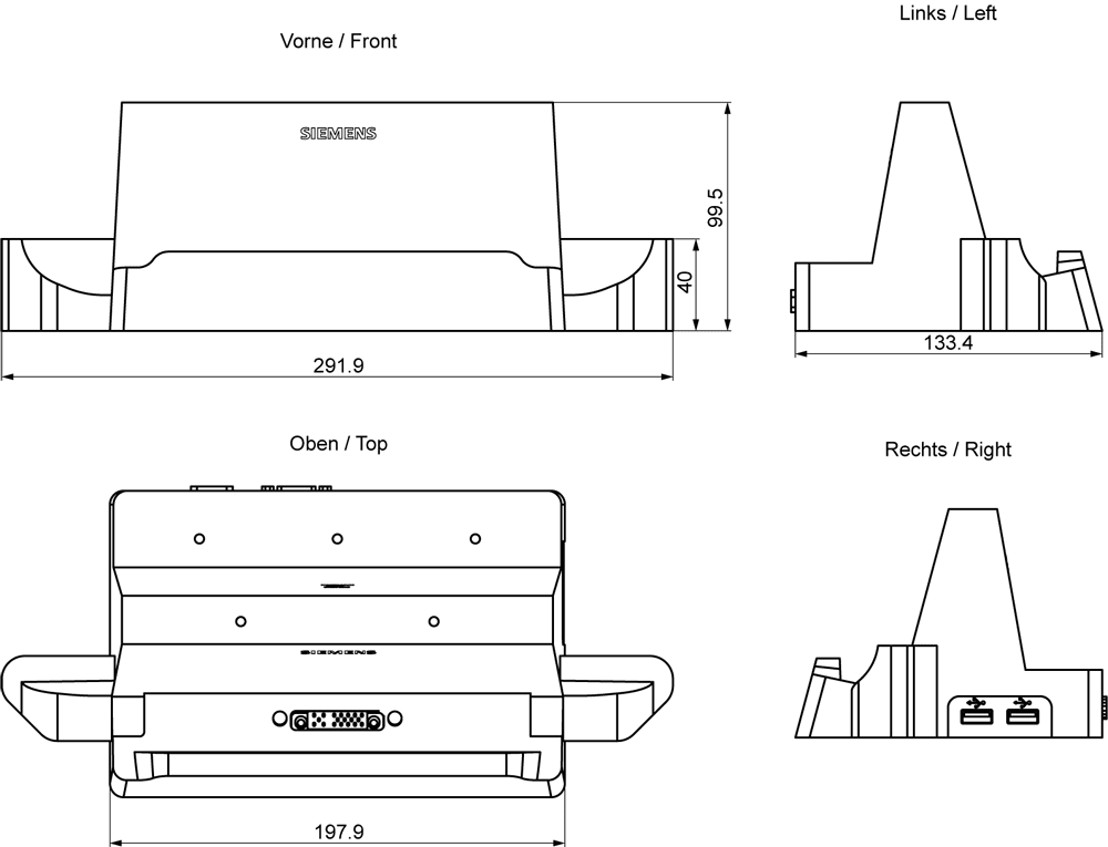 SIMATIC IPC MD-34A Desk Docking accessori; MD-34A tutte le configurazioni; 1x LAN 10/100 Mbits/s, 2x USB 2.0; 1x RS-232; 1x VGA, ingresso DC 19 V laterale; 2x USB 2.0; utilizzare il cavo di collegamento alla rete MD-34A per il Desk Dock Accessori per SIMATIC IPC