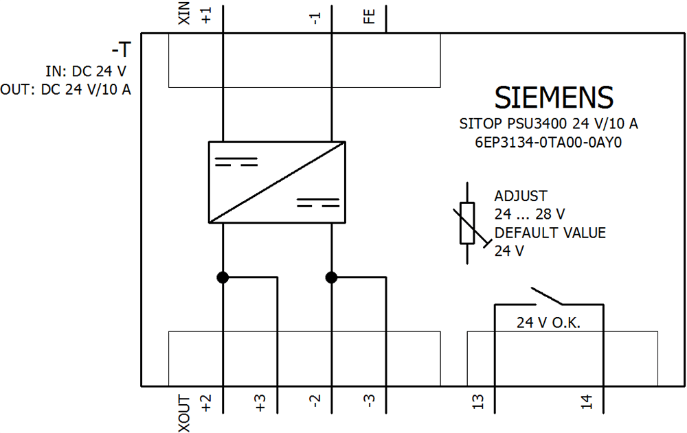 SITOP PSU3400 24 V/10 A alimentatore stabilizzato ingresso: DC 24 V (14 … 32 V) uscita: DC 24 V/10 A Convertitore di tensione continua SITOP PSU3400 per unalimentazione di tensione stabile a 12 V o 24 V anche in caso di oscillazioni della tensione di ingresso. Il convertitore DC/DC SITOP PSU3400, grazie al suo ampio campo della tensione di ingresso, è perfettamente adatto per il funzionamento con tutte le batterie di uso corrente.