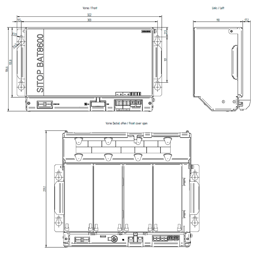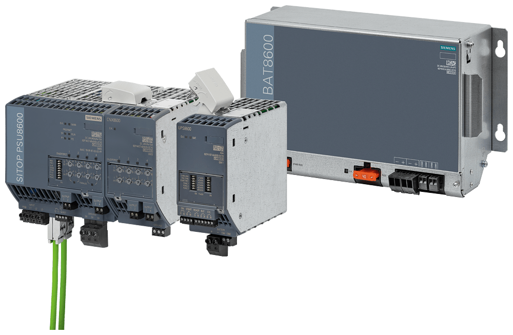 SITOP BAT8600 LiFePO4 modulo batteria per UPS8600 DC 48 V/358 Wh accumulatore di energia: batterie al litio ferro fosfato esenti da manutenzione Per la protezione in caso di lunghe mancanze della tensione di rete si può ampliare il sistema di alimentazione elettrica SITOP PSU8600 con il modulo UPS UPS8600 con i relativi moduli batteria BAT8600. In questo modo è possibile tamponare le uscite DC nellordine dei minuti e delle ore senza buchi di tensione. Durante il tamponamento è possibile arrestare limpianto in modo mirato e sicuro o eventualmente lasciarlo funzionare senza guasti. Il modulo batteria BAT8600, basato su batterie esenti da manutenzione LiFePo4 (litio-fosfato di ferro), dispone di un accumulatore di energia da 358 Wh e tampona per 21 minuti a960 watt. Collegando in parallelo fino a 5 BAT8600 dello stesso tipo, il tempo di tamponamento si può prolungare di conseguenza. La gestione intelligente della batteria assicura una caratteristica di carica dipendente dalla temperatura e sorveglia loperatività e il livello di carica della batterie.