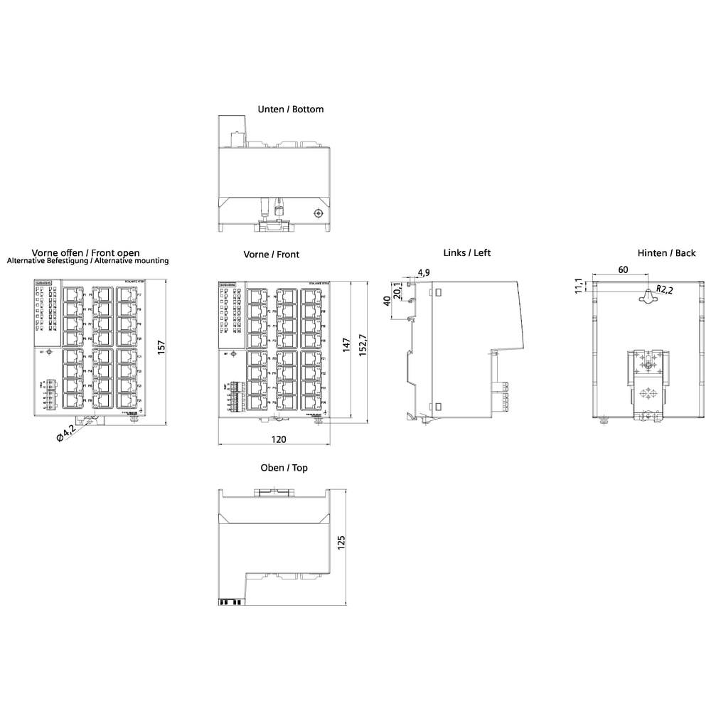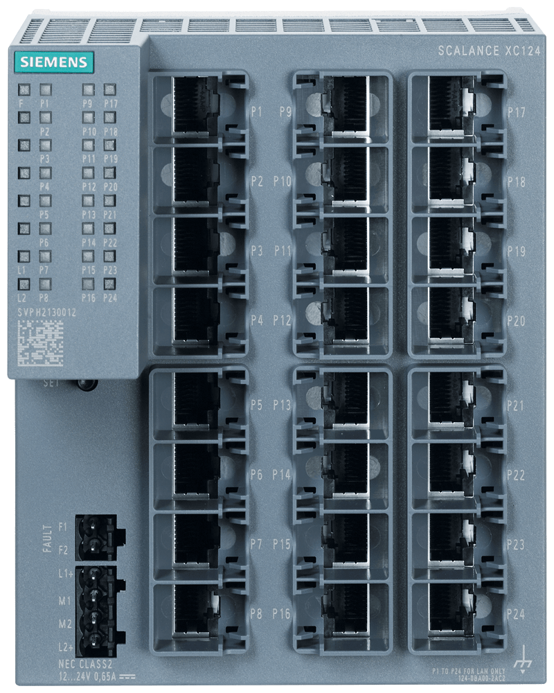SCALANCE XC124, IE unmanaged switch, 24x 10/100 Mbit/s RJ45, diagnostica LED, contatto di segnalazione errore con tasto SET, ridondanza della alimentazione di tensione manuale disponibile come download . SCALANCE XC124 unmanaged switch compatto, 24 x RJ45 da 10/100 Mbit/s per la semplice interconnessione di macchine in rete. Impiego in aree a rischio di esplosione, nella costruzione di macchine di serie e nellindustria di processo. Economico, semplice e versatile: uno SCALANCE XC124 è lo switch ideale per garantire una infrastruttura di rete affidabile e robusta. Con SCALANCE XC124 si trova sempre il giusto unmanaged switch per i collegamenti di reti elettriche e ottiche. Grazie allhardware potente e alle funzioni avanzate, assicura lintegrazione direttae la scalabilità per qualsiasi ambiente di rete. Con la nuova serie di unmanaged switch SCALANCE XCM-100 è possibile anche realizzare applicazioni Power over Ethernet. I nostri unmanaged switch e Media-Converter sono perfetti per limpiego in vicinanza delle macchine nelle reti industriali e resistono anche alle condizioni ambientali gravose.