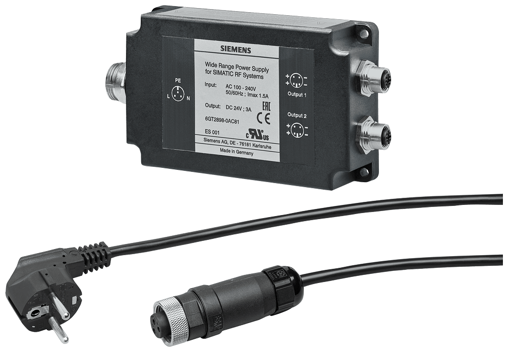 SIMATIC RF600 alimentazione di tensione wide-range per sistemi SIMATIC RF In: AC: 100 ... 240 V Out: DC 24 V 3 A CE, UL, CSA grado di protezione IP67 con cavo di rete/connettore CEE 7/7 comprendente: 1x 6GT28980AC81 1x 6GT28980AC01. SIMATIC RFAlimentatore da rete wide-range con cavo di collegamento UEPer lalimentazione di tensione a dispositivi di scrittura/lettura RFID. Con connettore UE/CEE 7/7 per limpiego in Europa.Due Reader direttamente collegabili. Alimentatore da rete industriale robusto e incapsulato in resina con elevato grado di protezione per limpiego diretto nel processo.