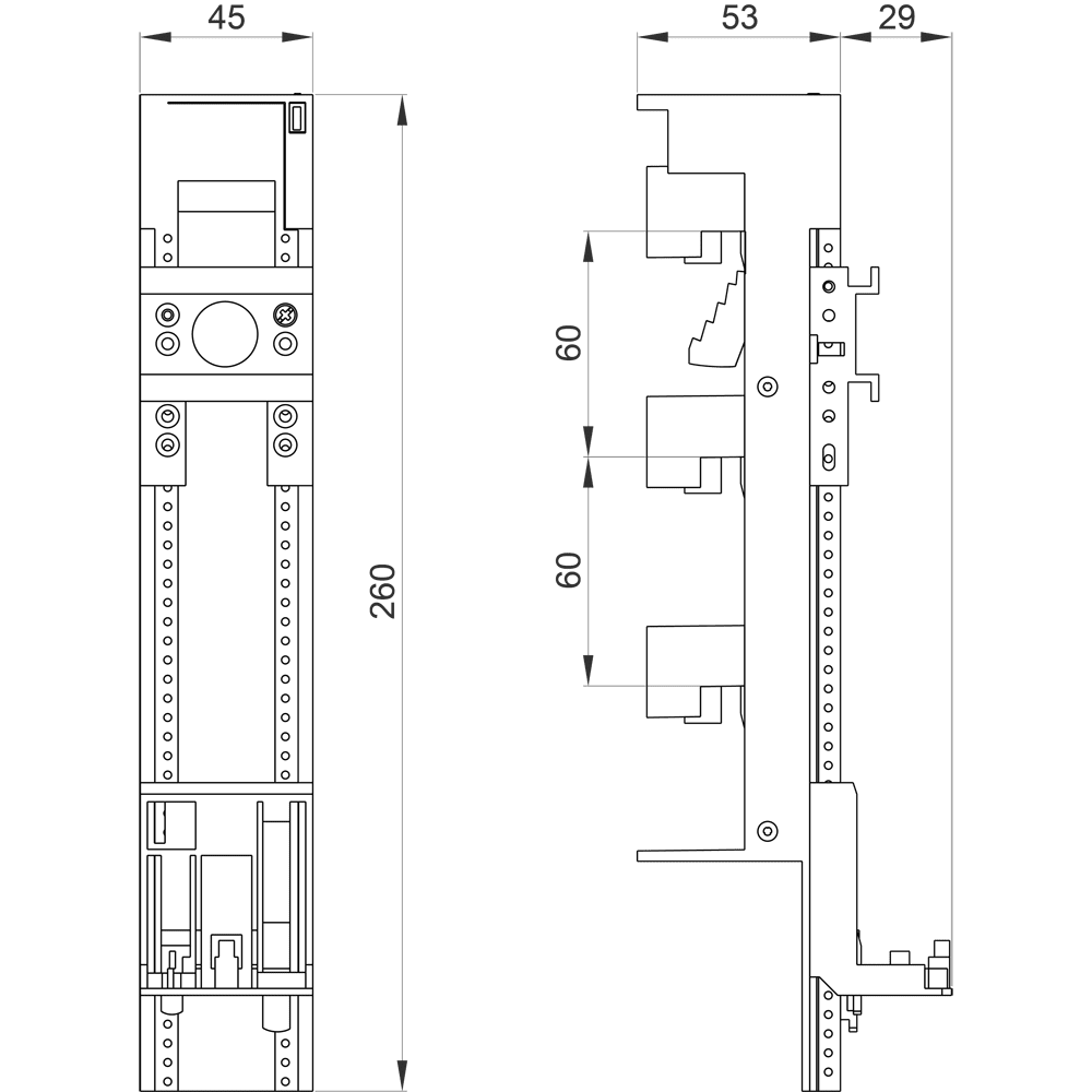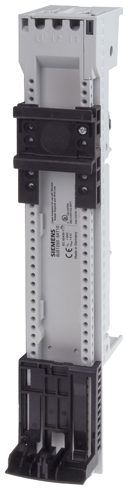 portapparecchi, lunghezza 45x 260mm per sistema di sbarre collettrici 60mm, distanziatore in dotazione 2 elementi di collegamento in dotazione profilato di supporto avvitato portapparecchi SENTRON 8US1 per sistemi di sbarre collettrici per il montaggio di dispositivi di protezione. I sistemi di sbarre collettrici 8US Siemens offrono molteplici possibilità per linstallazione di apparecchi di collegamento, manovra e installazione adattabili a sbarre. La struttura modulare, così come il fissaggio meccanico e la contattazione elettrica in una sola operazione sono vantaggiosi. Grazie alla copertura di protezione a prova di dito degli adattatori e dei portapparecchi è garantita unelevata sicurezza di funzionamento. Sono dotati di una omologazione internazionale e consentono possibilità di impiego in tutto il mondo nel settore della costruzione di macchine e impianti. Il sistema di sbarre collettrici 8US1 è disponibile con interassi delle sbarre collettrici diversi. Sistemi di sbarre collettrici SENTRON - sicuri, poco ingombranti, organizzati in modo chiaro.