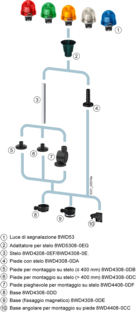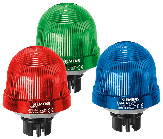 luce fissa di segnalazione, con LED integrato, blu, AC/DC 24 V, diametro 70 mm Luce fissa SIRIUS 8WD53 incl. elemento luminoso per la segnalazione visiva in condizioni ambientali gravose e in impianti in ambiente esterno, ad es. per la sorveglianza ottica dello stato di funzionamento in impianti di produzione. Le luci di segnalazione sono estremamente resistenti a urti e vibrazioni. La loro forma speciale consente unemissione luminosa ottimale di lato e verso lalto. Oltre che per luce continua sono disponibili lampade per luce lampeggiante, luce rotante e luce flash in diversi colori e per diverse tensioni. Come accessori sono fornibili piedi, adattatori, lampade a incandescenza, LED e adattatori stelo. Colonnine di segnalazione SIRIUS 8WD - Modulari e con funzionalità di comunicazione.