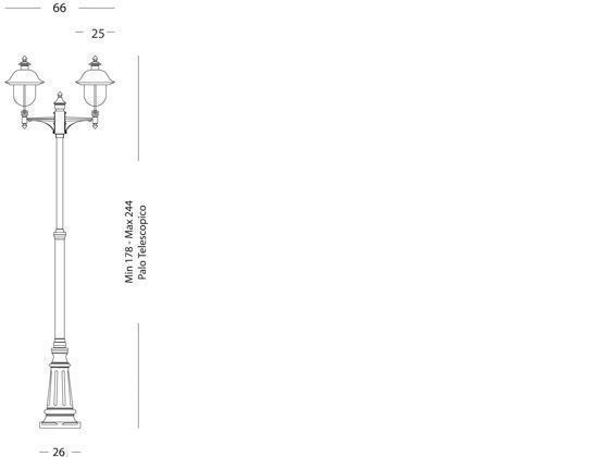 Palo con struttura in pressofusione di alluminio. Copertura superiore in rame. Diffusore in termoplastico trasparente. Triangolo di fissaggio a terra. Altezza max lampada: 150mm. Alimentazione 230 V ~ 50 Hz. Classe di protezione: IP43 Numero lampade: 2 Potenza massima lampade: 100W