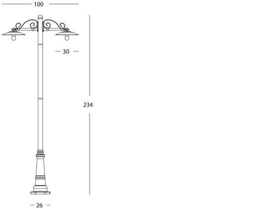 Struttura in pressofusione di alluminio. Piatti verniciati e smaltati bianco. Dima per il fissaggio a terra, dispositivo di connessione e accessori per il fissaggio. Portalampada in porcellana con attacco E27. Copri portalampada con guarnizione in gomma siliconica. Adatta per lampade a risparmio energetico con protezione in silicone. Lampada esclusa. Alimentazione 230V ~ 50Hz. Classe di protezione: IP43 Numero lampade: 2 Potenza massima lampade: 25W