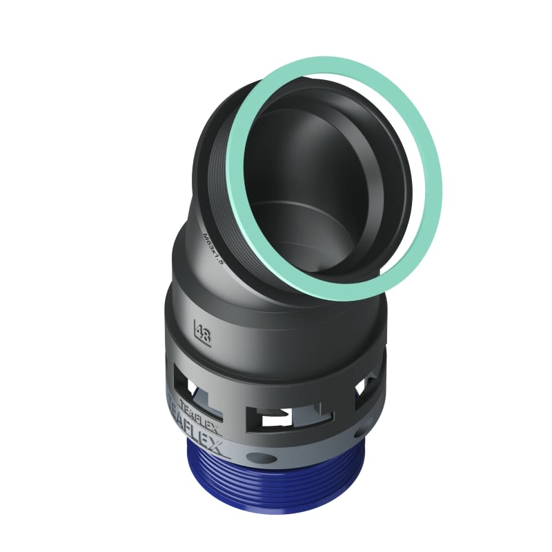 La curva a 45° grazie alla particolare costruzione senza spigoli interni permette un facile inserimento dei cavi annullando la possibilità che gli stessi vengano danneggiati. Soddisfa i requisiti standard nelle installazioni elettriche e nelle applicazioni tecniche industriali IP68/IP69K.