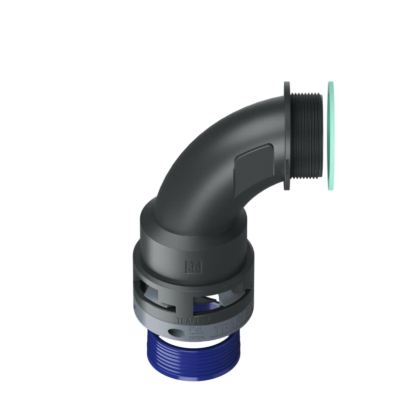 La curva a 90° grazie alla particolare costruzione senza spigoli interni permette un facile inserimento dei cavi annullando la possibilità che gli stessi vengano danneggiati. Soddisfa i requisiti standard nelle installazioni elettriche e nelle applicazioni tecniche industriali IP68/IP69K.