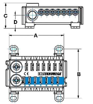 Morsettiera di distribuzione, marca TEKNOMEGA SRL, modello TKGRPU5010 - RIPARTITORE BIPOL.80A 7 OUT INNEESTO MOL