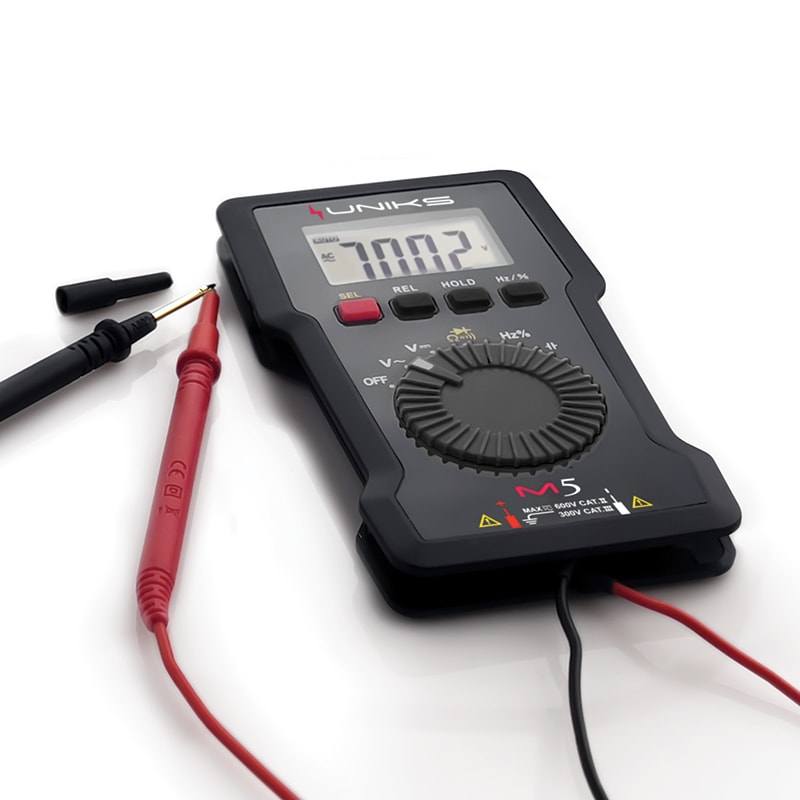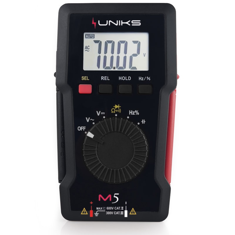 UNIKS M5 e il multimetro digitale tascabile di semplice utilizzo grazie i puntali di misura integrati ed avvolgibili. Esegue misure di Tensione AC-DC fino a 600V, di Resistenza, capacita, frequenza, Duty Cycle e test diodo inoltre la misura di continuita viene indicata anche da un LED.