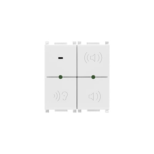 Microfono per chiamata selettiva o generale, funzione di attivazione con la voce per il controllo dei bambini (Baby Control) e ascolto ambientale - 2 moduli. Il dispositivo permette di rilevare e trasmettere sul bus del sistema di diffusione sonora il segnale vocale captato dal microfono frontale in modo da attivare le funzionalità di Chiamata Generale, Chiamata Selettiva, Baby-Control o Ascolto Ambientale. In caso di chiamata le zone coinvolte diffondono il segnale audio relativo alla chiamata stessa; al termine di quest’ultima ogni zona riprende il funzionamento immediatamente precedente alla chiamata. Il tasto basculante destro inoltre, può anche essere configurato per effettuare funzioni diverse da quelle standard di Chiamata Generale e Selettiva e può essere utilizzato come comando automazione (controllo luci, tapparelle, ecc.) o per altre funzioni audio legate alla diffusione sonora.