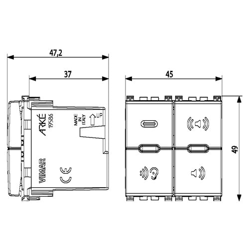 Microfono per chiamata selettiva o generale, funzione di attivazione con la voce per il controllo dei bambini (Baby Control) e ascolto ambientale - 2 moduli. Il dispositivo permette di rilevare e trasmettere sul bus del sistema di diffusione sonora il segnale vocale captato dal microfono frontale in modo da attivare le funzionalità di Chiamata Generale, Chiamata Selettiva, Baby-Control o Ascolto Ambientale. In caso di chiamata le zone coinvolte diffondono il segnale audio relativo alla chiamata stessa; al termine di quest’ultima ogni zona riprende il funzionamento immediatamente precedente alla chiamata. Il tasto basculante destro inoltre, può anche essere configurato per effettuare funzioni diverse da quelle standard di Chiamata Generale e Selettiva e può essere utilizzato come comando automazione (controllo luci, tapparelle, ecc.) o per altre funzioni audio legate alla diffusione sonora. Bianco.