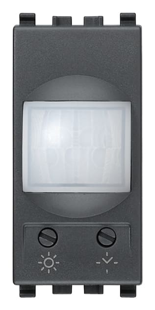Interruttore con sensore di presenza ad infrarossi per accensione luci, soglia del sensore crepuscolare e ciclo di temporizzazione regolabili, uscita a relè NO 6 A 230 V~, alimentazione 230 V~ 50-60 Hz, grigio