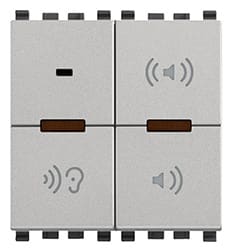 Microfono per chiamata selettiva o generale, funzione di attivazione con la voce per il controllo dei bambini (Baby Control) e ascolto ambientale - 2 moduli. Il dispositivo permette di rilevare e trasmettere sul bus del sistema di diffusione sonora il segnale vocale captato dal microfono frontale in modo da attivare le funzionalità di Chiamata Generale, Chiamata Selettiva, Baby-Control o Ascolto Ambientale. In caso di chiamata le zone coinvolte diffondono il segnale audio relativo alla chiamata stessa; al termine di quest’ultima ogni zona riprende il funzionamento immediatamente precedente alla chiamata. Il tasto basculante destro inoltre, può anche essere configurato per effettuare funzioni diverse da quelle standard di Chiamata Generale e Selettiva e può essere utilizzato come comando automazione (controllo luci, tapparelle, ecc.) o per altre funzioni audio legate alla diffusione sonora. Next.