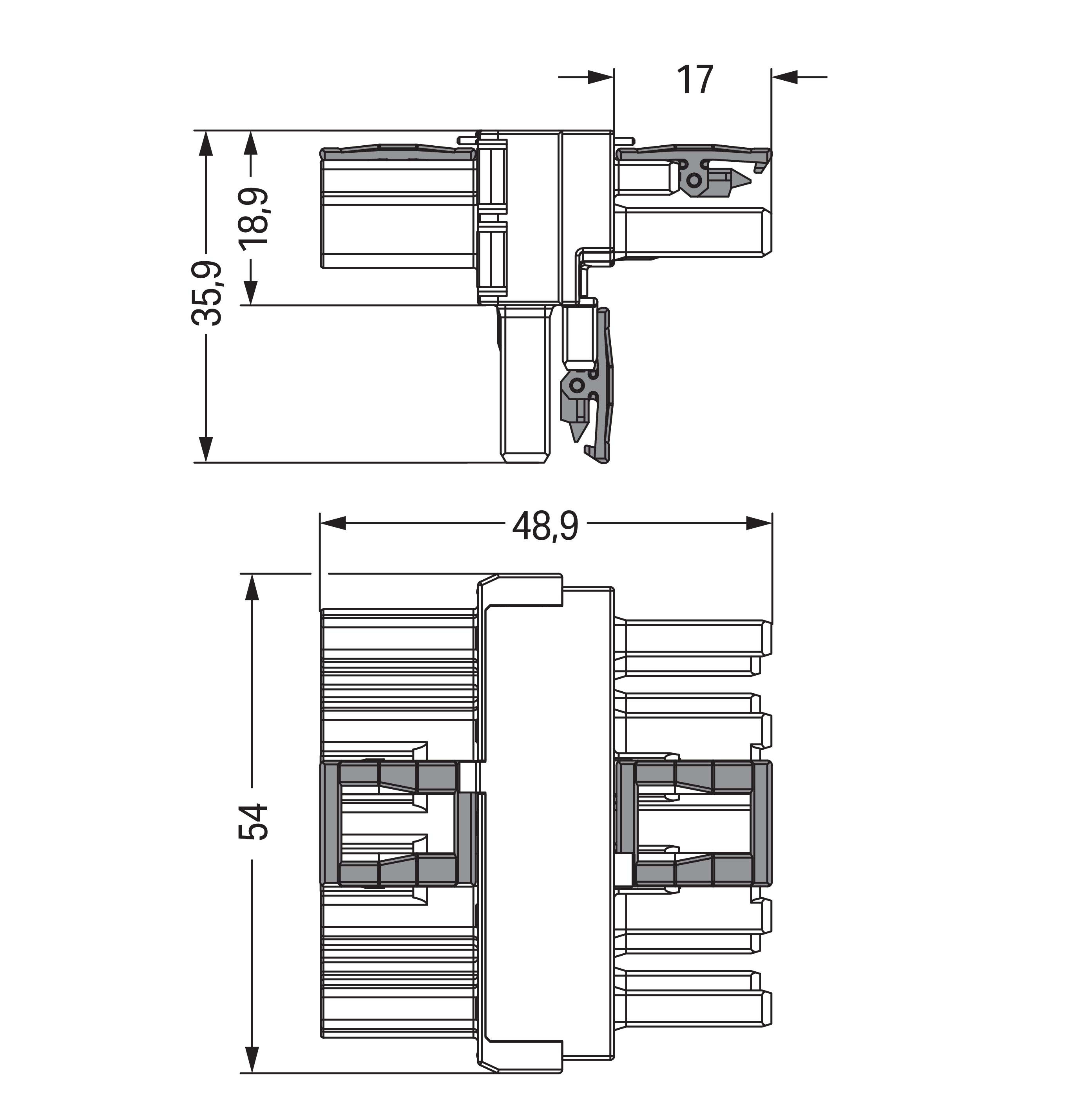 T-Verteiler; 5-polig; Kod. A; 1 Eingang; 2 Ausgänge; 3 Verriegelungsklinken; für fliegende Verbindungen; schwarz