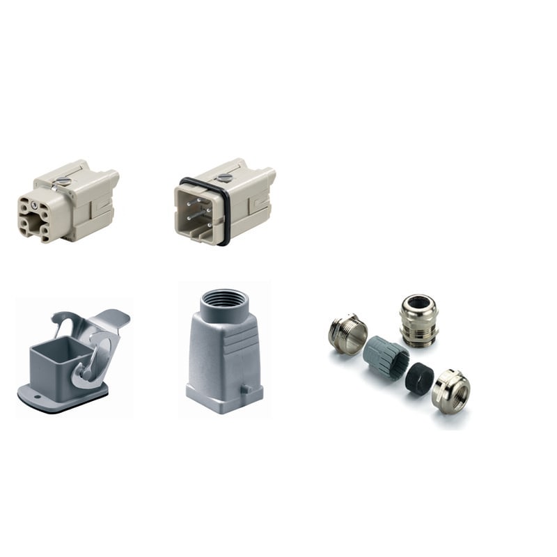 Set connettore a innesto industriale, composto da inserto, custodia e pressacavo.
