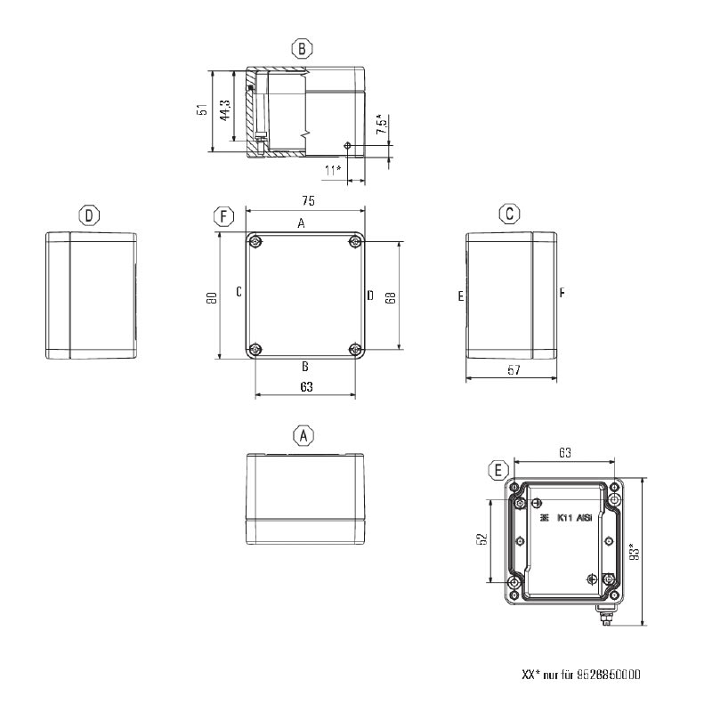 Custodia in metallo adatta all'uso in zone a rischio di esplosione. I fori per il montaggio sono posti all'esterno dell'area di tenuta stagna. Il montaggio a muro può essere realizzato utilizzando fori di montaggio o piedini di montaggio.
