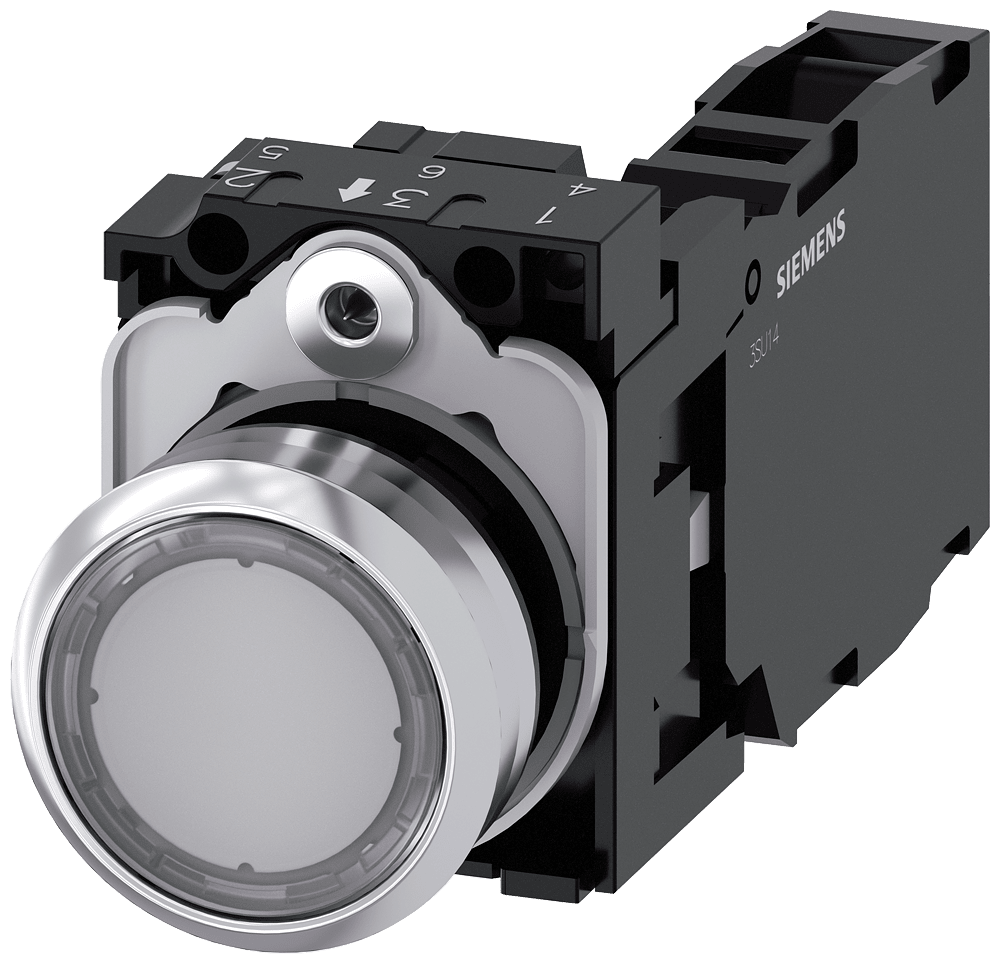 pulsante, 22 mm, rotondo, in metallo, lucido, trasparente, bottone, piatto, ad impulso, con supporto, 1 NO+1 NC, morsetto a vite Pulsante SIRIUS ACT per la commutazione e il comando di utilizzatori elettrici. Siemens offre, sotto il nome commerciale SIRIUS ACT, un portfolio esclusivo di dispositivi di comando e segnalazione con omologazioni di prodotto per il mercato mondiale in tre moderne serie di design in robusto metallo puro e plastica pregiata.Linnovativo concetto di innesto a scatto semplifica talmente il montaggio che per eseguirlo basta una sola mano e non servono attrezzi speciali. Per i fori di montaggio sono sufficienti semplici fori non scanalati, essendo già integrata una protezione antirotazione al 100 %.Grazie al grado di protezione elevato i robusti apparecchi sono adatti allimpiego industriale e in ambiente esterno. È persino possibile la pulizia con getto ad alta pressione. Né polvere, né oli, né liscivia possono comprometterne il funzionamento affidabile.Oltre che con il cablaggio standard, gli apparecchi possono essere collegati al controllore anche tramite PROFINET, AS-Interface oppure IO-Link. Potete così ridurre il vostro onere di cablaggio, minimizzare le fonti di errore e ottenere maggiore flessibilità.Il configuratore online grafico supporta in modo confortevole la scelta e lordinazione di singoli apparecchi, pulsantiere e iscrizioni. È disponibile una documentazione completa (ad es. manuale, dati 3D, schema di collegamento). Esecuzioni fornibili: più colori, luminoso/non luminoso, con/senza iscrizione, comando permanente/ad impulso, diverse altezze di bottone e ghiera. Avvertenza: Apparecchio completo, fornitura incl. supporto e moduli. SIRIUS ACT - Performance in Action nel comando e nella segnalazione. Semplici da montare, altamente performanti, semplicemente perfetti.