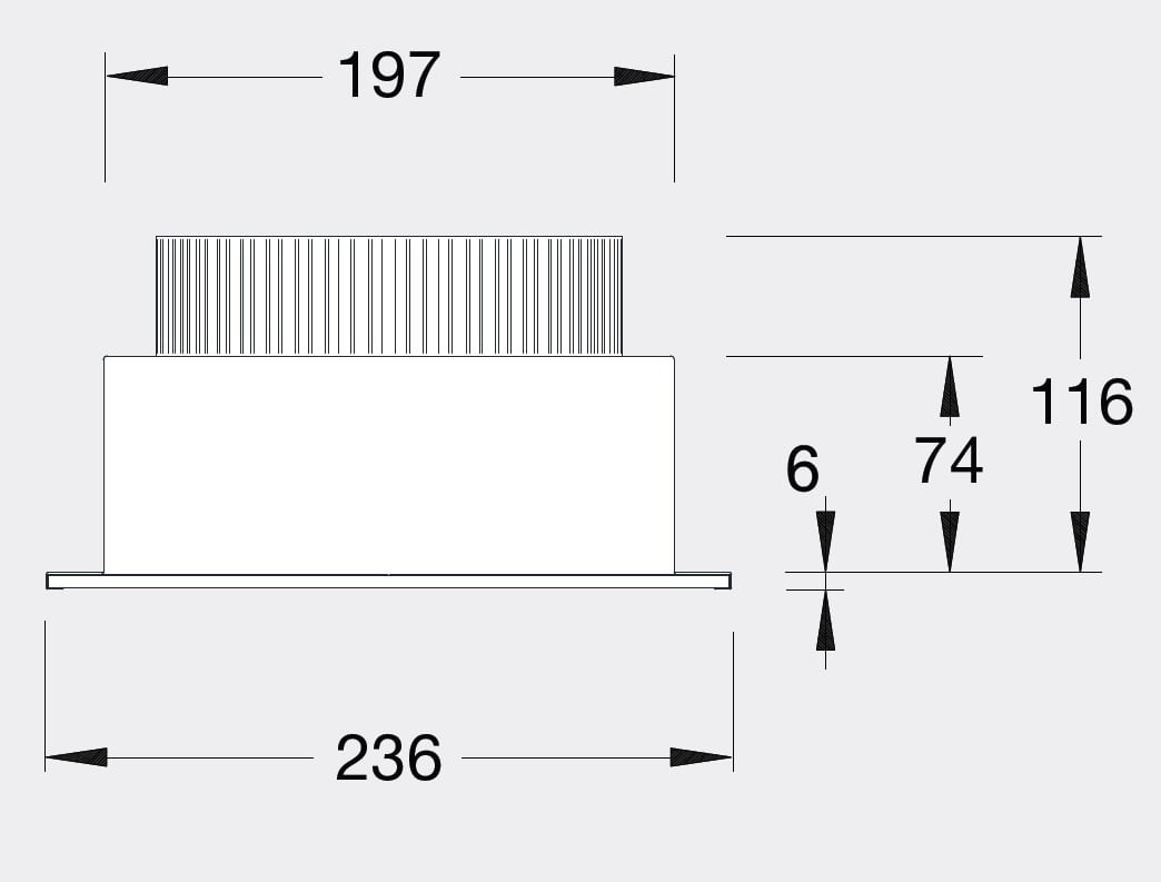 Lucequadro LED 18W VS. Rendimento luminoso 100%. Flusso luminoso dell'apparecchio 1806 lm. Distribuzione diretta simmetrica. Luminanza media <3000 cd/m² per angoli >65° radiali. UGR <18 (EN 12464-1). Efficienza apparecchio 95 lm/W. Durata utile (L85/B10): 50000 h. (Tj 65°C). Corpo in acciaio verniciato di colore bianco. Dissipatore passivo di calore in alluminio anodizzato, sovradimensionato, per una ottimale gestione termica del modulo LED. Recuperatore di flusso in alluminio a specchio con trattamento superficiale al titanio e magnesio, assenza di iridescenza. Vetro temprato stampato, non combustibile, anabbagliante, spessore 4mm. Fissaggio vetro a incastro nelle sedi laterali in alluminio a specchio. Staffe di fissaggio in acciaio zincato. Cuffie in policarbonato copri asole. Dimensioni: 235x235 mm, altezza 120 mm. Peso 3,5 kg. Grado di protezione IP44 parte in vista. Resistenza meccanica 6,5 joule. Resistenza al filo incandescente 960°C. Unità di cablaggio separata. Cablaggio elettronico, 230V-50/60Hz, fattore di potenza >0,90, corrente costante in uscita, SELV, classe I. Potenza dell'apparecchio 19 W. Modulo LED compatto da 18W/840, temperatura di colore 4000 K. Resa cromatica Ra >80.