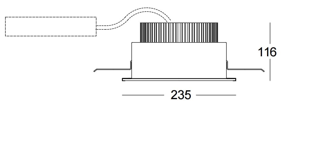 Rendimento luminoso 100%. Flusso luminoso dell'apparecchio 2826 lm. Distribuzione diretta simmetrica. UGR <26 (EN 12464-1). Efficienza apparecchio 104 lm/W.Corpo in acciaio verniciato di colore bianco.Dissipatore passivo di calore in alluminio anodizzato, sovradimensionato, per unaottimale gestione termica del modulo LED.Recuperatore di flusso in alluminio a specchio con trattamento superficiale al titanio emagnesio, assenza di iridescenza.Schermo in metacrilato opale.Fissaggio vetro a incastro nelle sedi laterali in alluminio a specchio.Staffe di fissaggio in acciaio zincato.Cuffie in policarbonato copri asole.Dimensioni: 235x235 mm, altezza 116 mm. Peso 3,035 kg.Grado di protezione IP44 per la parte in vista, IP20 per la parte incassata.Resistenza meccanica agli urti IK08 (6,5 joule).Resistenza al filo incandescente 960°C.Unità di cablaggio separata.Cablaggio elettronico 230V50/60Hz, fattore di potenza >0,95, corrente costante in uscita,SELV, classe I.Potenza dell'apparecchio 27,2 W. Alimentatore 230 Vac/Vdc conforme EN 60598-2-22. In DC la potenza e il flusso di default sono pari al 100%, in AC restano al 100%.Temperatura ambiente +25°C. Modulo LED compatto da 3000/840.Codice fotometrico 840/339.Indice di resa cromatica CRI >80.Temperatura di colore nominale CCT 4000 K.