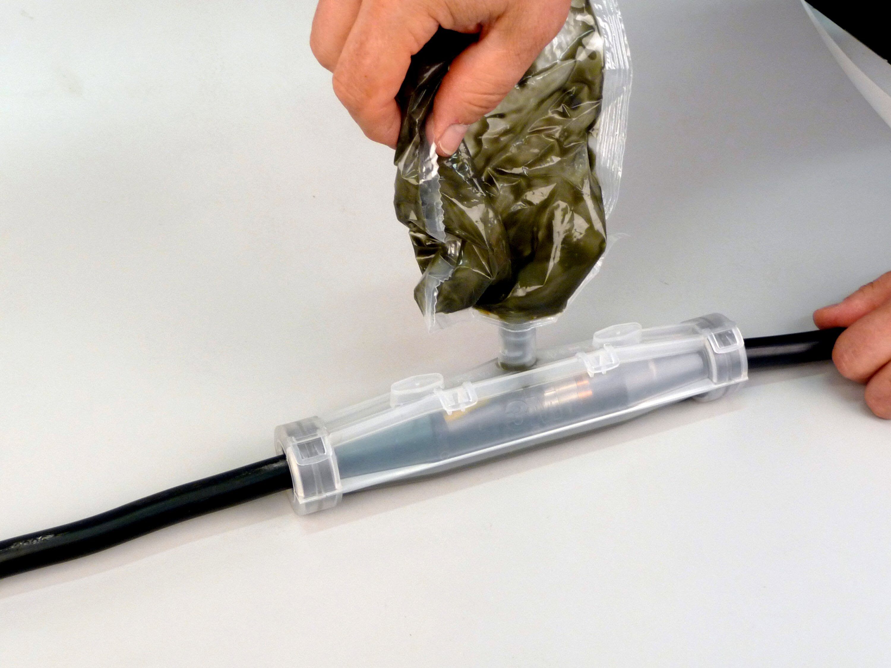 Kit per giunzione in linea 3M™ Scotchcast™ 92-NBA5, 1 kV,(19-45 mm) Il modello RoHS 3M™ Scotchcast™ è conforme al kit in resina poliuretanica per giunture della conduttura Premium In per usi generici. La linea di serie 92-NBA è adatta per applicazioni fino a 1 KV coprendo la sezione trasversale del cavo principale per dimensioni che vanno da 1,5 mm2 a 240 mm2. Il design del kit serie 92-NBA consente una facile e rapida installazione grazie al nuovo beccuccio brevettato 3M™ integrato nel sacchetto in resina e nel contenitore del kit. L'impostazione corretta dei cavi viene assicurata dalla completa trasparenza del contenitore del kit. La resina poliuretanica 3M™ Scotchcast™ 40 idrorepellente è conforme agli standard CENELEC HD631.1 S2 e alle direttive UE 2002/95/EC (RoHS) e UE 1907/2007/EC (REACH), garantendo così il maggior grado di isolamento elettrico per applicazioni professionali.