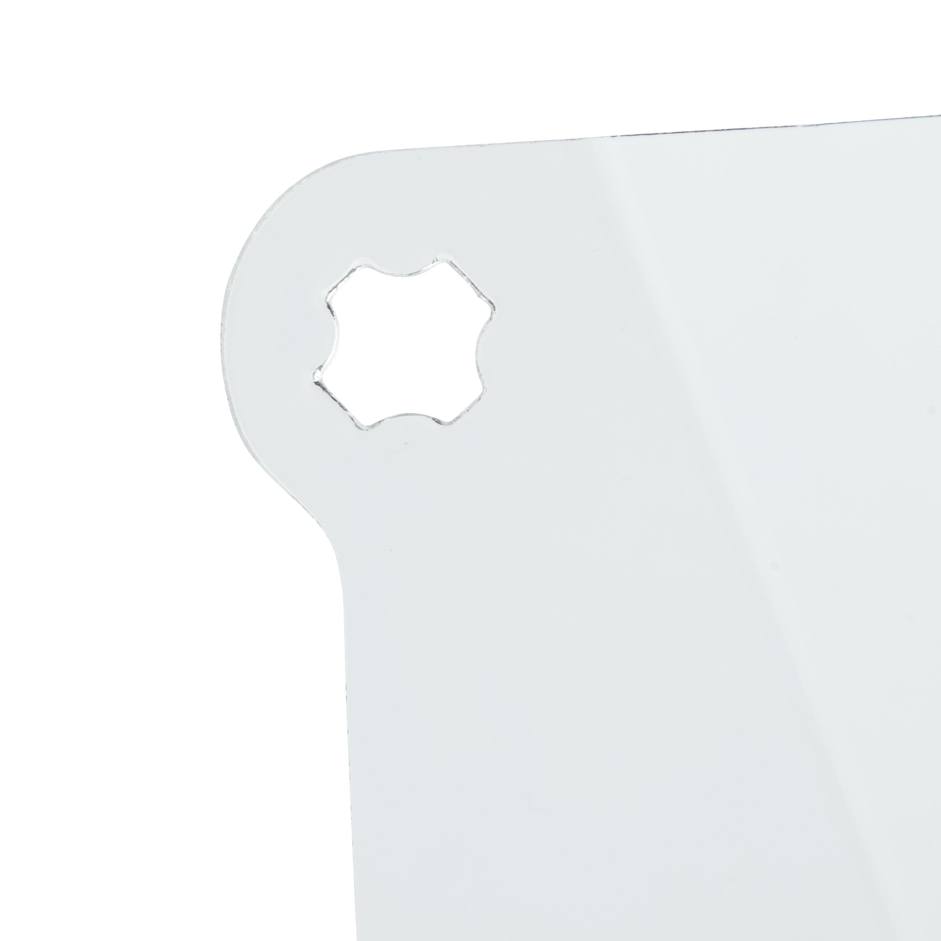 Visiera 3M™, visorino corto, policarbonato, trasparente, misura grande, V4KK Ottieni protezione da impatti, metalli fusi e solidi incandescenti con la visiera 3M™ V4KK. La nostra visiera in policarbonato trasparente dello spessore di 1,2 mm con visorino corto è progettata per gli elmetti 3M™. Soddisfa i requisiti di protezione F per gli schermi di protezione dagli impatti a bassa energia.