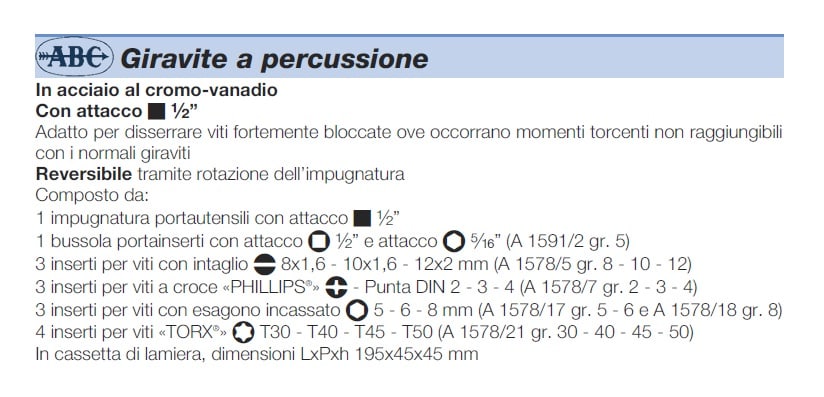 In acciaio al cromo-vanadio adatto per disserrare viti fortemente bloccate ove occorrano momenti torcenti non raggiungibili con i normali giraviti. Reversibile tramite rotazione dell'impugnatura. In cassetta di lamiera, dimensioni LxPxh 195x45x45 mm.