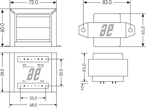 ** Utilizzo ** Adatto per montaggio a circuito stampato o a pannello ** Caratteristiche Generali ** Avvolgimenti Secondari: 12+12V Potenza: 40VA Tolleranza tensione d'ingresso: ±10% Frequenza d'ingresso: 50Hz Tolleranza tensione d'uscita: ±10% Pin PRI: 2-7 Pin SEC: 10-11 14-15 Schema: B Tipo nucleo: EI68/30 Classe di temperatura: B