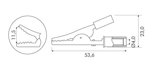 ** Caratteristiche Generali ** Tipo Connettore: Pinza Colore: Rosso ** Caratteristiche Elettriche ** Corrente max: 10A Tensione max: 50V ** Caratteristiche Meccaniche ** Materiale Corpo: ABS Materiale Contatto: Acciaio nichelato Diametro cavo max: 4mm