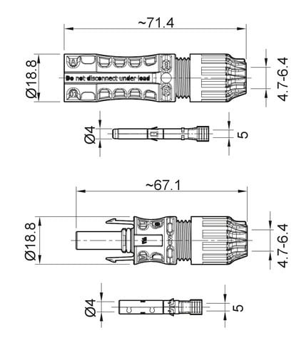 ** Caratteristiche Generali ** Serie produttore: Solarline Tipo Connettore: MC4 Evo 2 Colore: Nero Genere Corpo: Maschio+Femmina Genere Contatto: Maschio+Femmina Serie Fornitore: MC4-Evo 2 ** Caratteristiche Elettriche ** Corrente max: 30A Tensione max:1500V Tensione Isolamento: 6 KV ** Caratteristiche Meccaniche ** Tipo contatto: a crimpare Terminazione: a crimpare Montaggio connettore: volante Sezione conduttori: 4-6mm² Diametro cavo min: 4.7mm Diametro cavo max: 6.4mm Grado di protezione: IP65 ** Caratteristiche Termiche ** Classe di infiammabilità: UL94V-0