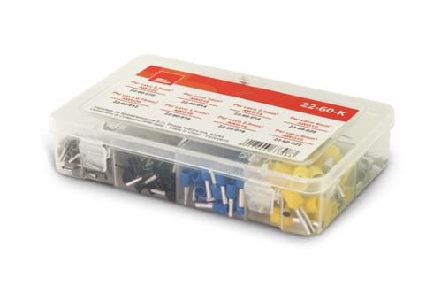 Pratica scatoletta con otto scomparti di puntalini capicorda a bussola per cavi da 0,5 a 6,0mm². La confezione contiene: 22-60-010 bianco - 0,5mm² - 22AWG - 100pz 22-60-012 grigio - 0,75mm² - 20AWG - 100pz 22-60-014 rosso - 1,0mm² - 18AWG - 50pz 22-60-016 nero - 1,5mm² - 16AWG - 50pz 22-60-018 blu - 2,5mm² - 14AWG - 50+50pz 22-60-020 grigio - 4,0mm² - 12AWG - 25pz 22-60-022 giallo - 6,0mm² - 10AWG - 25pz Totale: 450 pezzi