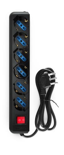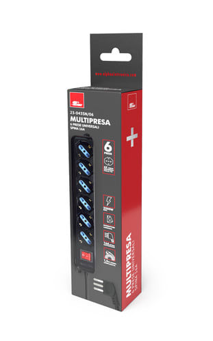 ** Caratteristiche Generali ** Colore: Nero Tipo di prese: Universale Italia P40 Numero di prese Universali: 6 Numero di Prese Totali: 6 Tipo di spina: Italia - 16A 2P+T S17 - Salvaspazio ad angolo ** Caratteristiche Elettriche ** Tensione max: 250V Potenza max collegabile: 2500W ** Caratteristiche Meccaniche ** Materiale corpo: Termoplastico rinforzato Materiale contatti: Lega di rame Cavo Alimentazione: H05VV-F 3G1 3x1,0mm² Lunghezza cavo complessiva: 1.5m Colore cavo: Nero Accensione: Con interruttore luminoso Sistemi sicurezza: Alveoli protetti da contatti accidentali, Prese con protezione bimbi Protezioni: Messa a terra per ogni presa