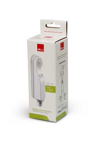 ** Caratteristiche Generali ** Principio di funzionamento: Infrarossi Colore: Bianco ** Caratteristiche Elettriche ** TipoTensione: ac Tens. funzionamento AC: 230Vac Tolleranza d'ingresso: ±10% Frequenza: 50-60Hz Consumo energetico stand-by: 0.1W Consumo energetico operativo: 0.5W ** Caratteristiche dei contatti ** Potenza massima carico capacitivo: 500W Potenza massima carico resistivo: 1200W ** Installazione ** Luogo d'impiego: Esterno/Interno Montaggio: Soffitto Altezza d'installazione: 2 - 6m Campo di rilevamento: 360° Range max di movimento: 10m ** Caratteristiche Meccaniche ** Grado di protezione: IP65 ** Regolazioni ** Periodo di accensione: 10s - 30min Livello di luminosità: 3 - 2000lux ** Caratteristiche Termiche ** Temp. di funzionamento:-10 / 40°C ** Note ** Il sensore di movimento è idoneo ad essere installato anche all'esterno in posizione riparata da pioggia e neve dirette.