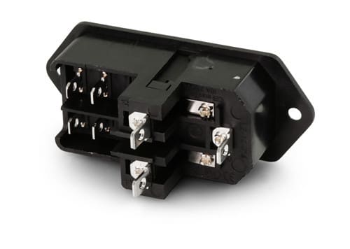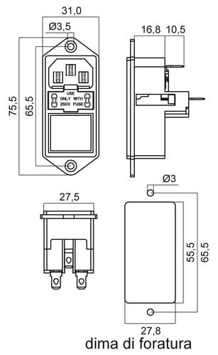 ** Caratteristiche Generali ** Genere: Spina Norma di riferimento: EN 60320 Foglio tecnico: C14 ** Caratteristiche Elettriche ** Corrente max: 10A Tensione max: 250V ** Caratteristiche Meccaniche ** Materiale Corpo: Termoplastico rinforzato con fibra di vetro Materiale Contatto: Lega di rame Tipo contatto: faston 4.8mm Montaggio connettore: pannello ** Caratteristiche Termiche ** Temperatura di lavoro: 0/70°C Fusibili non inclusi
