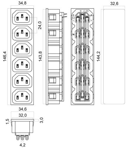 ** Caratteristiche Generali ** Genere: Presa Norma di riferimento: EN 60320 Foglio tecnico: C13 Colore: Nero Orientamento: Dritto ** Caratteristiche Elettriche ** Corrente max: 10A Tensione max: 250V ** Caratteristiche Meccaniche ** Materiale Corpo: Termoplastico rinforzato con fibra di vetro Materiale Contatto: Lega di rame Tipo contatto: faston 4.8mm Terminazione: a saldare Montaggio connettore: pannello Foro fissaggio: 32.6mm x 144.2mm ** Caratteristiche Termiche ** Temperatura di lavoro: 0/70°C